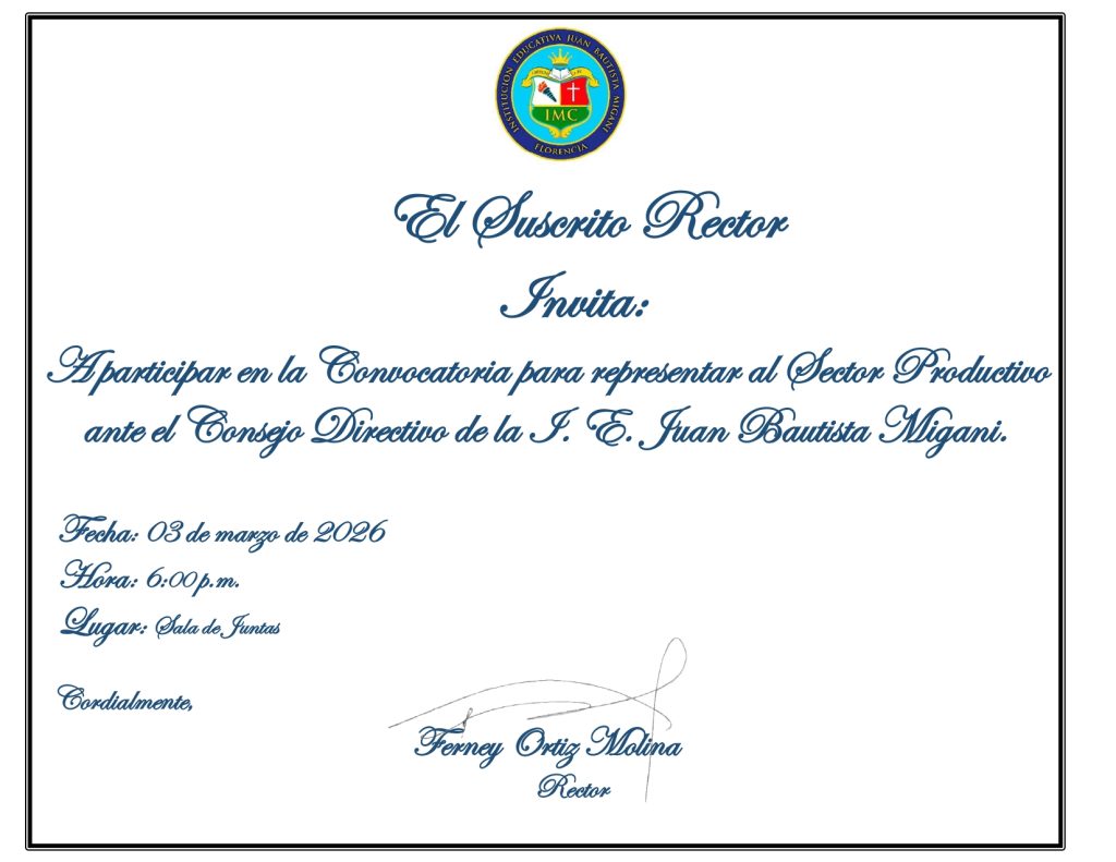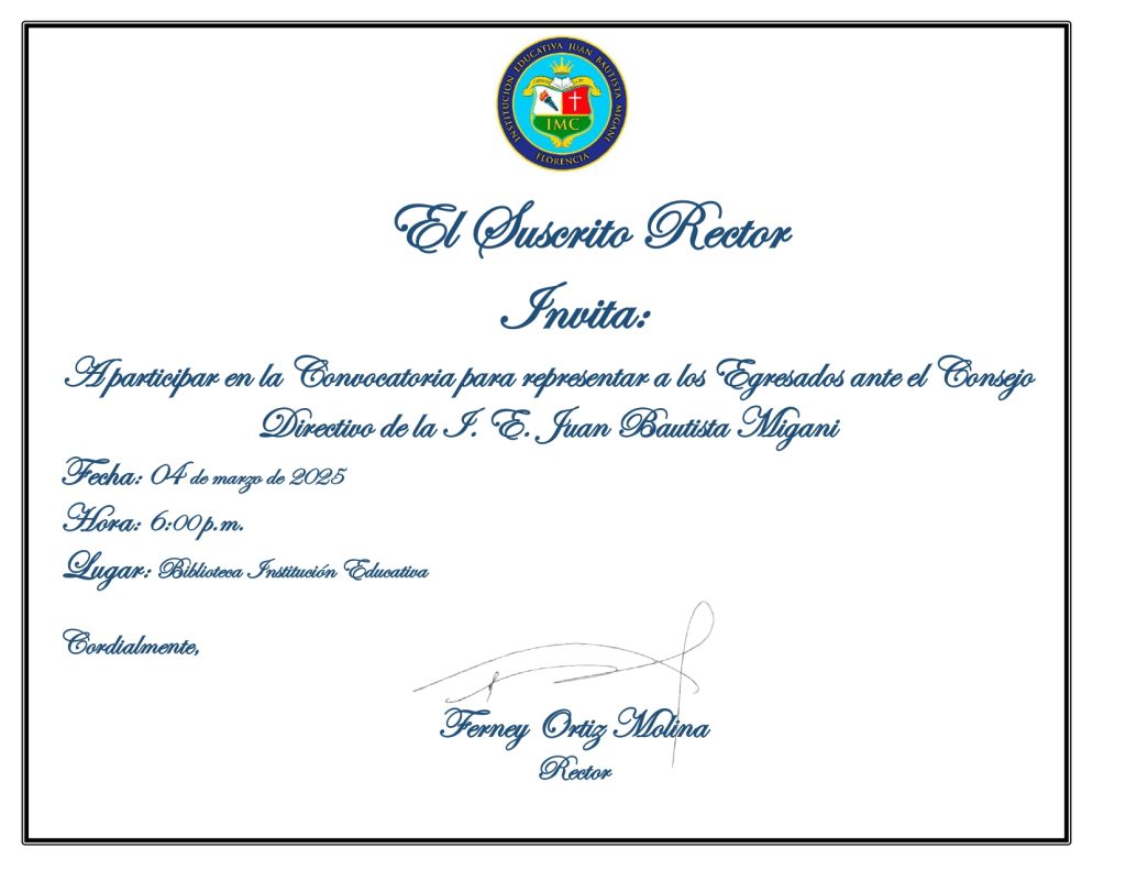 EI Rector de la Institución Educativa Juan Bautista invita a participar de la Convocatoria para Representar a los Egresados y el Sector Productivo ante el Consejo Directivo durante la vigencia 2026-2027.